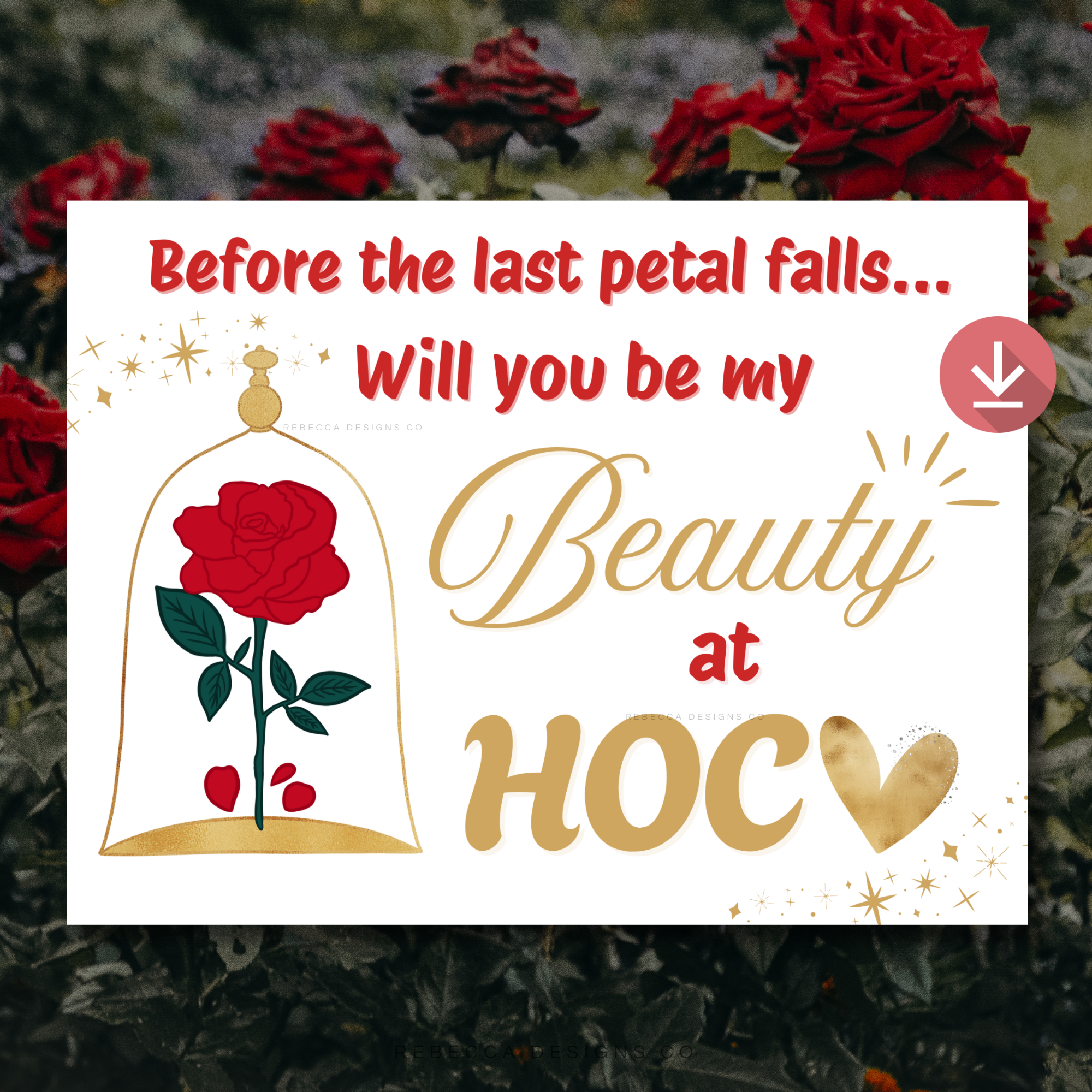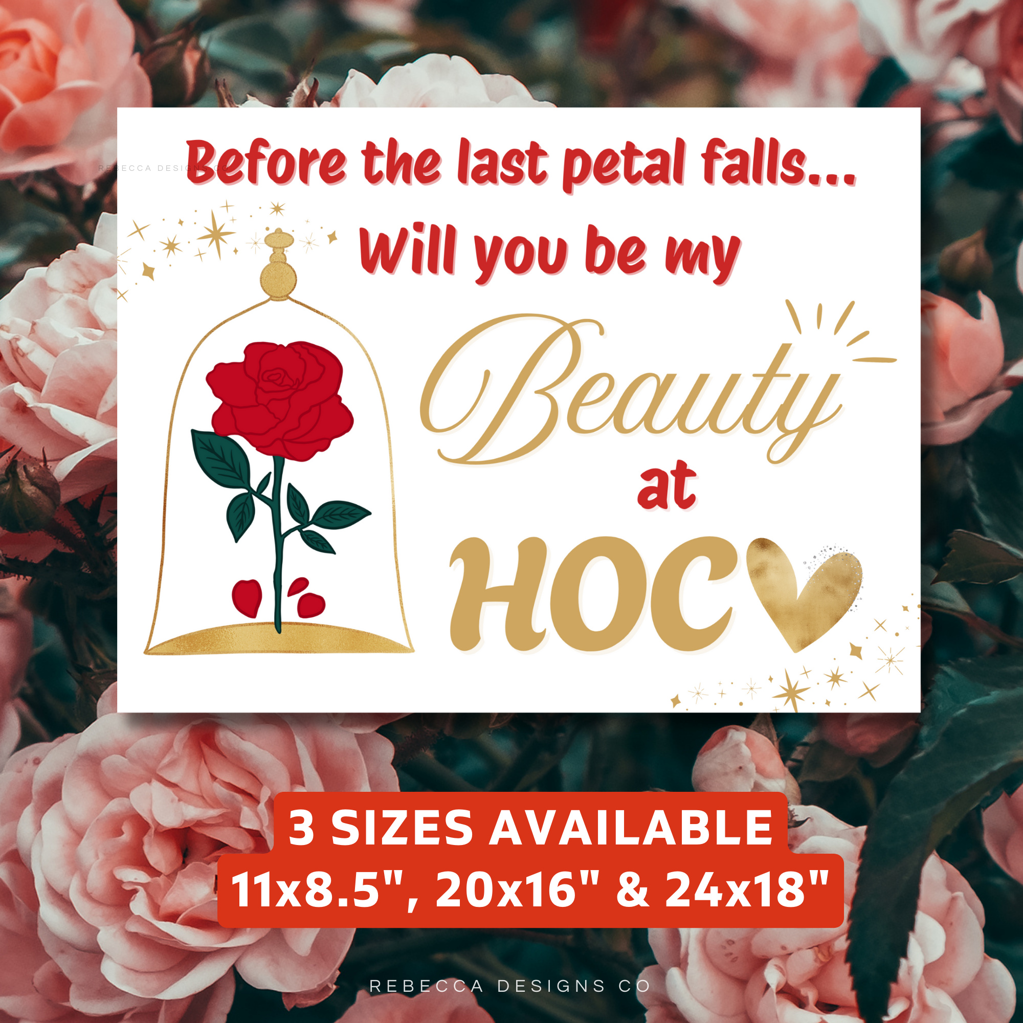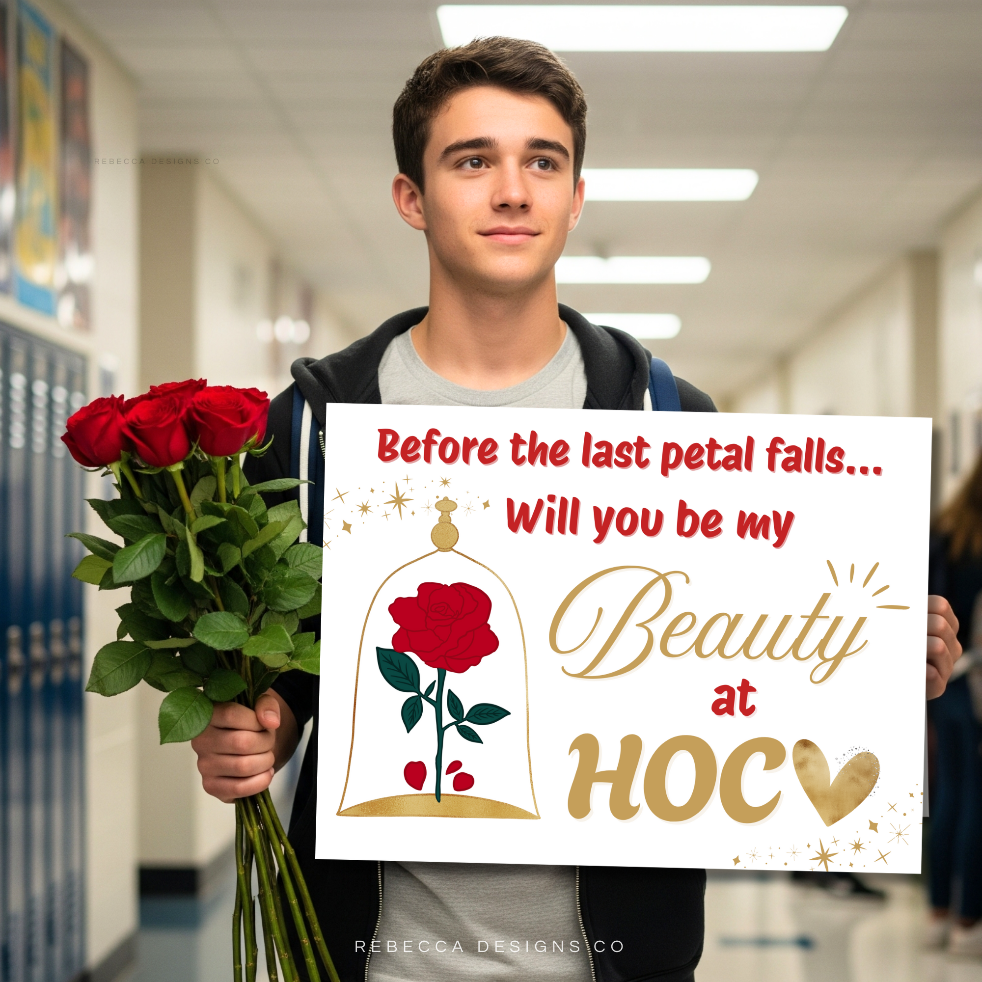 Make your Homecoming proposal unforgettable with this romantic red rose–themed poster featuring the sweet line “Before the last petal falls, will you be my beauty at HOCO?” 💕 This creative promposal sign is perfect to hold up at school, during a sports game, or to pair with a bouquet or a single rose. Inspired by a timeless enchanted love story, it’s a magical way to pop the question.